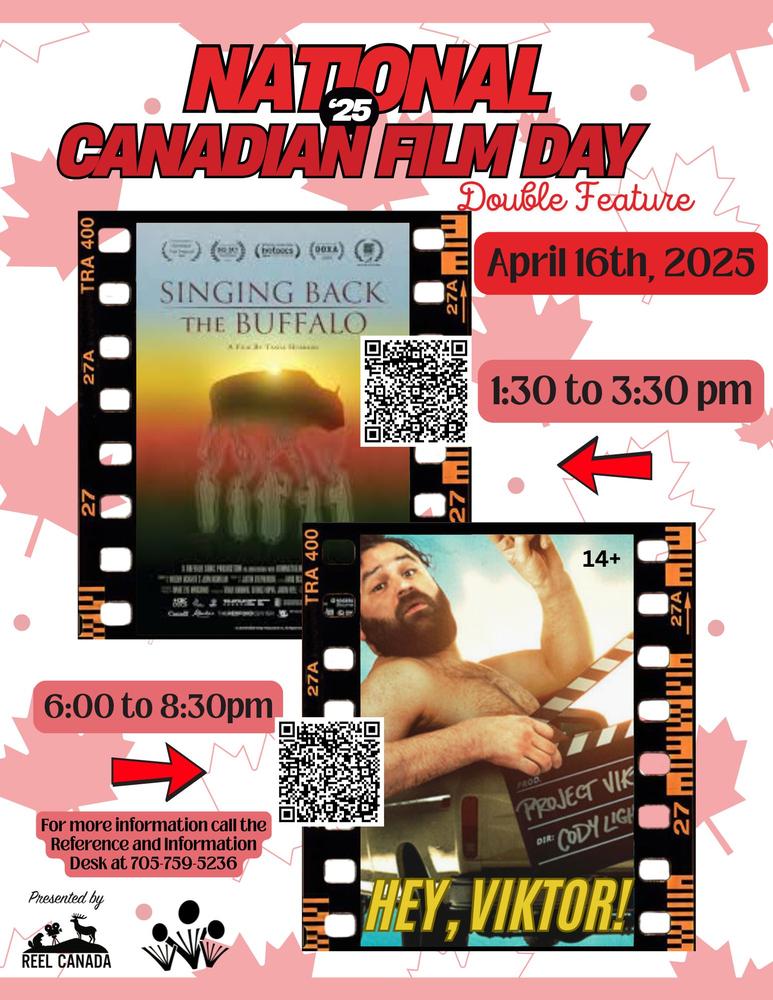 | National Canadian Film Day 2025: DOUBLE FEATURE Come celebrate the power of Canadian Film with your Sault Ste. Marie Public Library! This year there will be TWO films being shared! Matinee: Singing Back the Buffalo 1:30 pm to 3:30pm in the James L. McIntyre Centennial Library Program Room Evening: Hey, Viktor! 6:00pm to 8:30pm in the James L. McIntyre Centennial Library Program Room