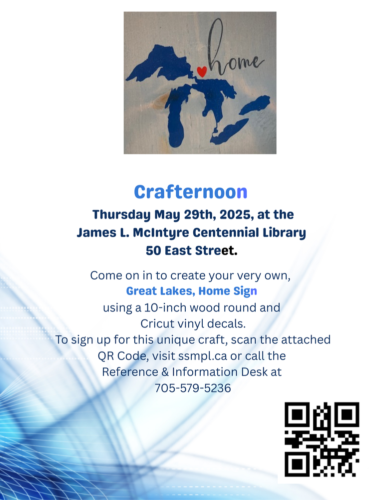 Great Lakes, Home Sign CrafternoonWant to make your home a little cozier? Come to the James L. McIntyre Centennial Library on May 29, 2025 from 2:00p.m. to 3:30p.m. to make your own GREAT LAKES, HOME SIGN! Design your 10-inch wood sign with cricut decals to welcome those to your home.