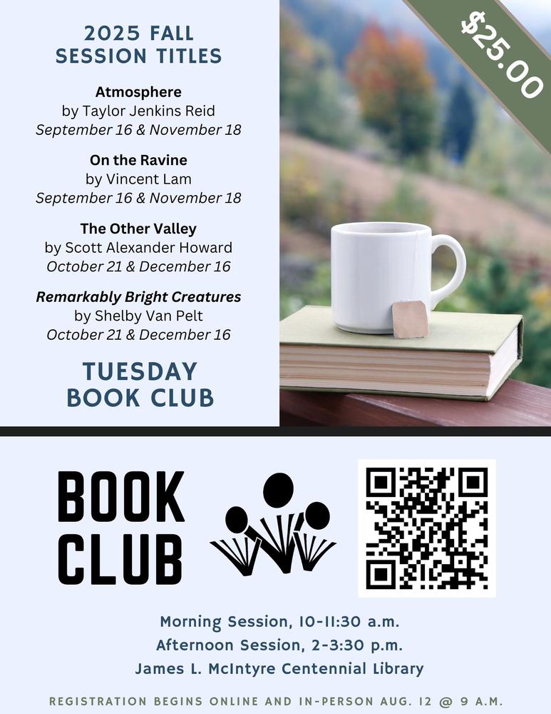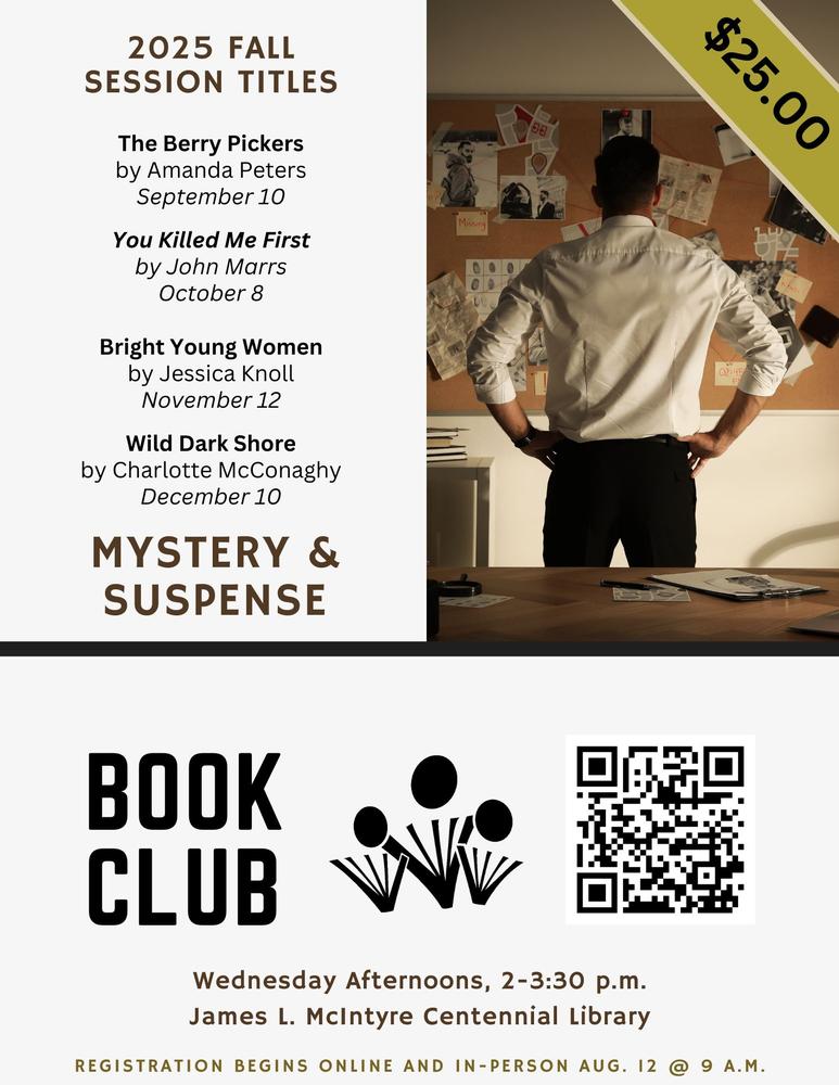 Book Clubs at the Sault Ste. Marie Public LibraryMake plans to join a book club this winter! The James L. McIntyre Centennial Library is hosting three book clubs, running from September to December 2025. Two sessions of 'The Tuesday Book Club' will meet on the third Tuesday of each month. (Morning session from 10 a.m. to 11:30 a.m.; afternoon session from 2 p.m. to 3:30 p.m.) October 21st November 18th December 16th Registration for the Tuesday Book Club will be available online starting Tuesday, August 12th, 2025, at 9 a.m. Cost is $25.00 per person. You must have an active Sault Ste. Marie Public Library card in order to participate. Click here to register: https://www.eventbrite.com/e/1497332585069/ The Mystery & Suspense Book Club will meet on the second Wednesday of each month from 2 p.m. to 3:30 p.m. Registration for the Mystery & Suspense Book Club will be available online starting Tuesday, August 12, 2025, at 9 a.m. Cost is $25.00 per person. You must have an active Sault Ste. Marie Public Library card in order to participate. Click here to register: https://www.eventbrite.com/e/1319082293649/ Anyone who does not wish to register and pay online must register and pay in-person at the James L. McIntyre Centennial Library, 50 East Street, at the Reference and Information Desk. For more information, please call 705-759-5236.